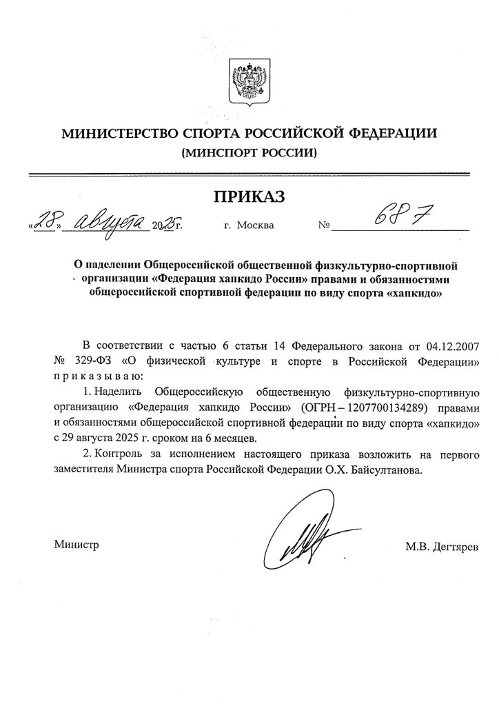 Приказом Министерства Спорта Российской Федерации № 687 от 28 августа 2025 года Общероссийская общественная физкультурно-спортивная организация “Федерация Хапкидо России” была наделена правами и обязанностями общероссийской спортивной федерации по виду спорта “хапкидо”.